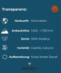 Unser Spezialitäten-Arabica aus Kolumbien nutzt ein natürliches Swiss-Water-Verfahren, das Aromen bewahrt, und ganz ohne Chemie auskommt. So bieten wir einen koffeinfreien Arabica-Kaffee (0,1%), der sowohl vollmundig als auch geschmacksintensiv ist.