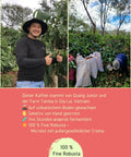 In Gia Lai, im vietnamesischen Hochland auf 800 Metern, arbeitet die Familie Quang seit Jahrzehnten mit Kaffee. Mr. Quang Junior gehört zu einer neuen Generation von Produzenten die Robusta nicht neu erfinden wollen — sondern ernst nehmen. Mit Zeit, Präzision und dem Fokus auf Reife statt Ertrag. Das Ergebnis ist eine Fine Robusta Varietät TR4-TR9 von der Farm Tamba, die 144 Stunden in anaerober Fermentation verbringt bevor sie getrocknet wird. Fabian röstet sie schonend in Franken damit das was auf der Farm entsteht auch in der Tasse ankommt.
